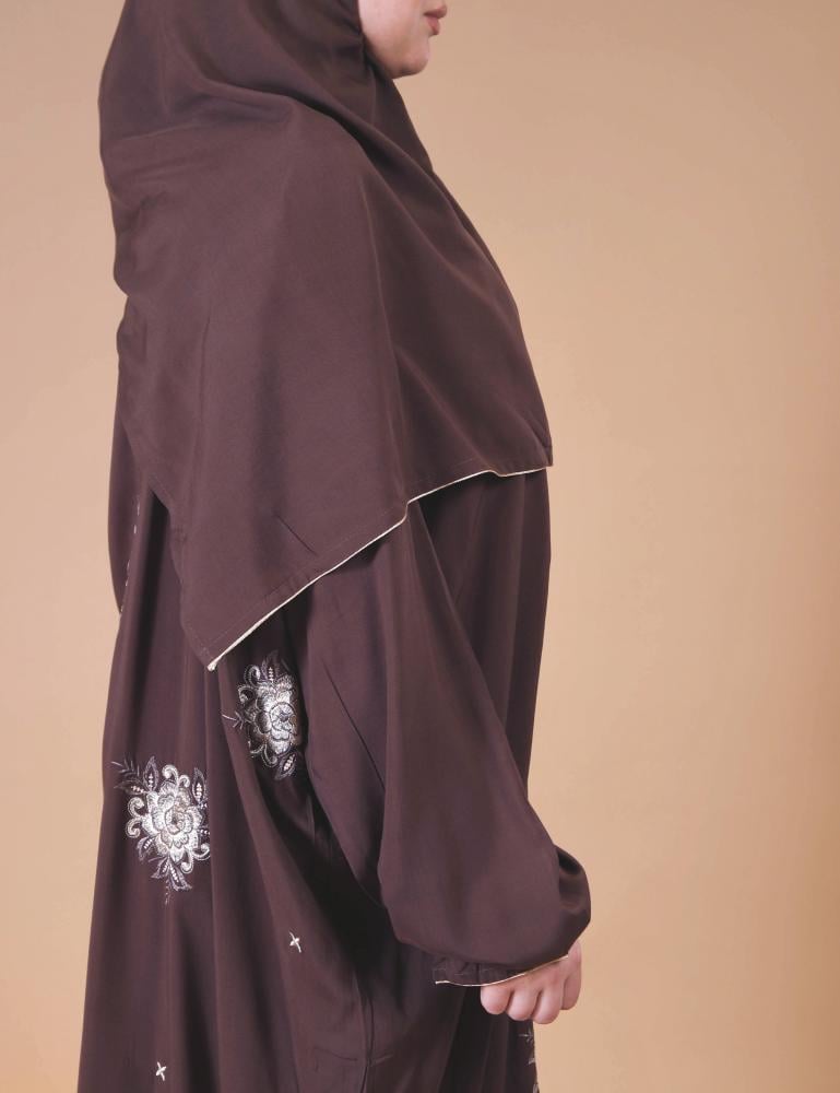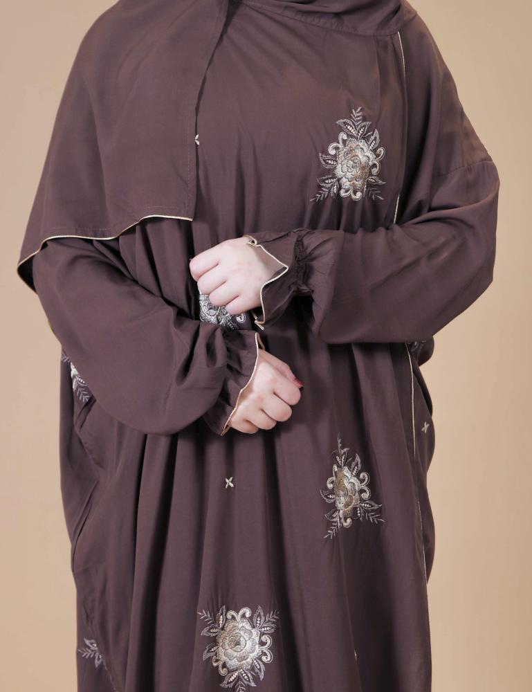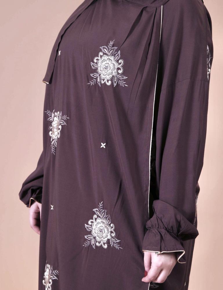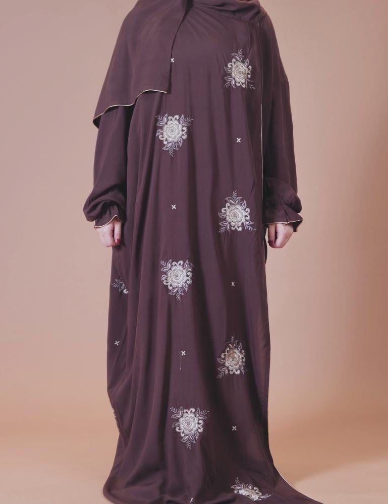 - يتميز بقماش القطن عالي الجودة باللون البني ومزين بتطريز ورد الجوري ليضفي عليه لمسة من الأناقة